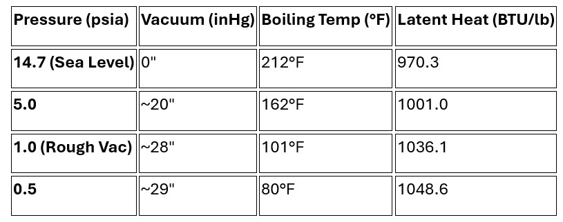 In a vacuum system, enthalpy and latent heat behave differently than they do at standard atmospheric pressure. As you lower the pressure (creating a vacuum), two major things happen: the boiling temperature drops, and the amount of energy required to evaporate the water increases.